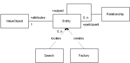 There is a consistent framework implemented in this API for querying and operating on entities along with their relationships (the framework is graphically depicted in figure 2 below). This framework is centered on the entity class itself. An entity class is a composite class that holds a reference to a value class that holds the defining attribute information for the entity, and provides access to other related entities with relationship-based interfaces. The relationships and attribute information are cached for the life of the entity, however, every time a relationship is evaluated, the entity, or entities, that participate in that relationship will be loaded from the data store. For example, the reference to the supervisor of a person is cached within the person entity class, but when the client requests the supervisor, the supervisor�s attribute information will be loaded from the data store at the time the supervisor entity is constructed.