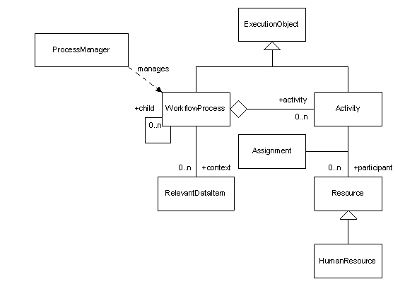 The UML class diagram in Figure 1 below illustrates the primary objects available in the API and their relationships. The primary object is the WorkflowProcess. A WorkflowProcess is parameterized by a set of RelevantDataItems and is implemented by a set of Activities. If an Activity is manual and requires the participation of a Resource, and Assignment is created to represent the task and fulfill the relationship. The most typical type of Resource is the HumanResource. There are several more objects available in the API that are not shown here. See the class level documentation for all classes in this package for a full specification.